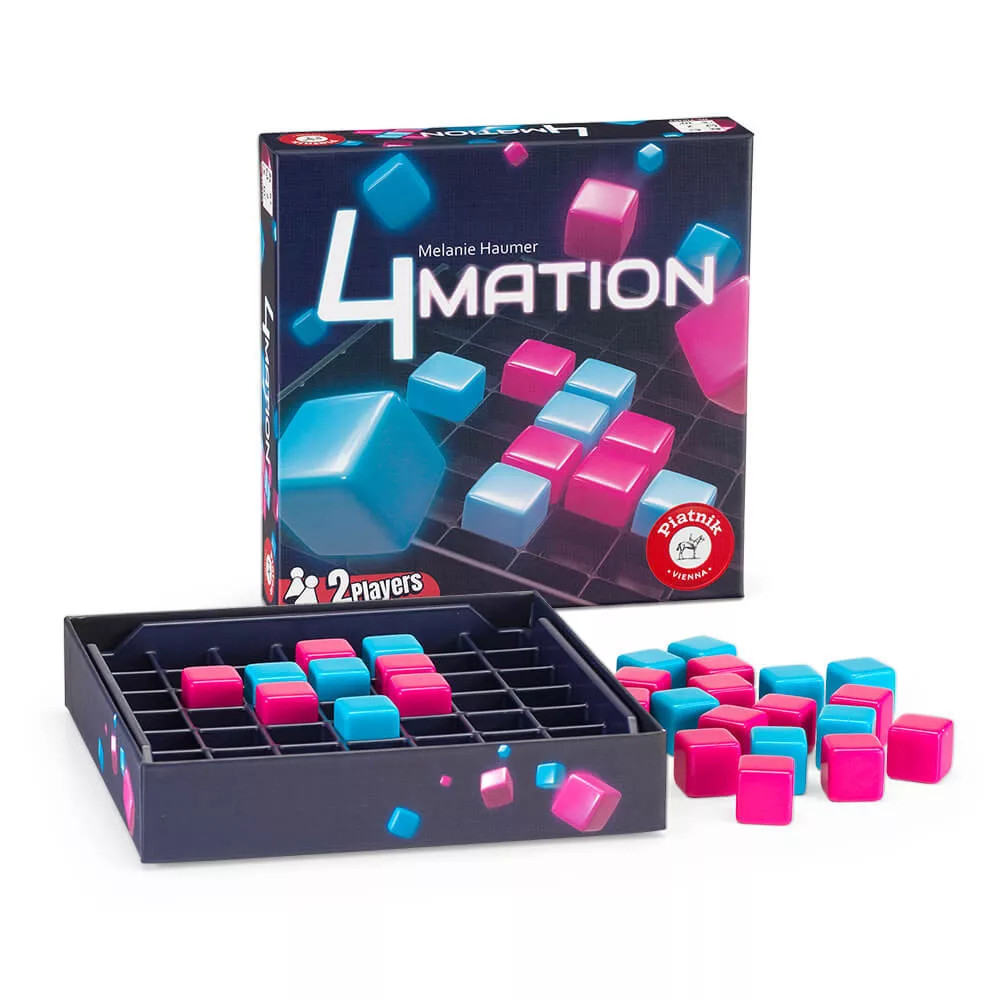 4Mation nevű logikai játékban az a célotok, hogy a saját színű kockáitok taktikus lehelyezésével vízszintesen, függőlegesen vagy átlósan elsőként álljon 4 darab kockátok egymás mellett. Ez nem is olyan egyszerű, mert a kockákat mindig úgy kell elhelyeznetek, hogy szomszédos legyen az utoljára elhelyezett kocka élével vagy sarkával.